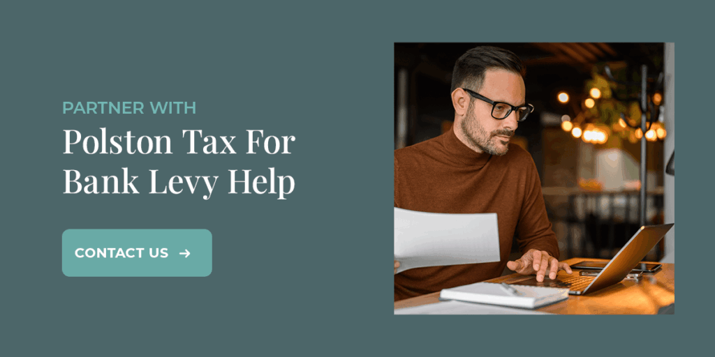 Since 2001, Polston Tax Resolution and Accounting has helped various organizations and individuals navigate bank levies. Our team of knowledgeable and experienced tax attorneys will work tirelessly to help. We will provide you with advice to mitigate future bank levies, help you eliminate penalties and interest and give you peace of mind, knowing that you have professionals on your side.