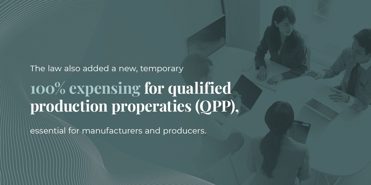 The law also added a new, temporary 100% expensing for qualified production properties (QPP), essential for manufacturers and producers. QPPs only need to meet certain requirements. Some of these requirements include: