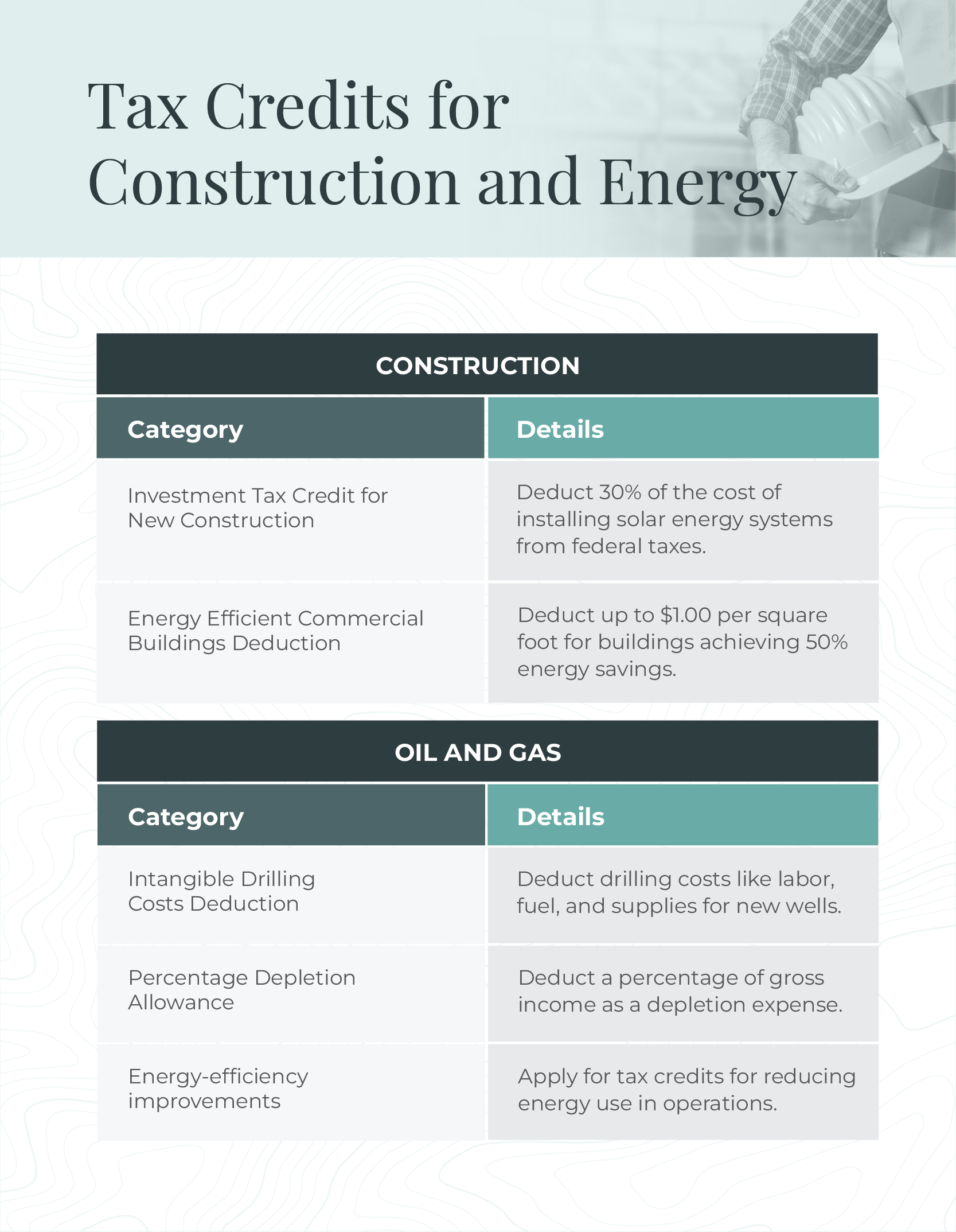 If you’re a business owner in energy or construction, there are specific tax credits and deductions you should know about in 2025. If you meet the criteria, you could be eligible for multiple business deductions and considerable tax savings over the year.