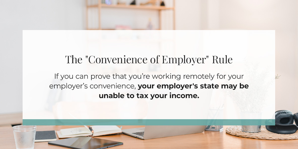 If you can prove that you’re working remotely for your employer’s convenience, your employer’s state may be unable to tax your income. The “convenience of employer” test will determine if the employee’s income is taxable. Each state may have its own guidelines for the “convenience of employer” test.