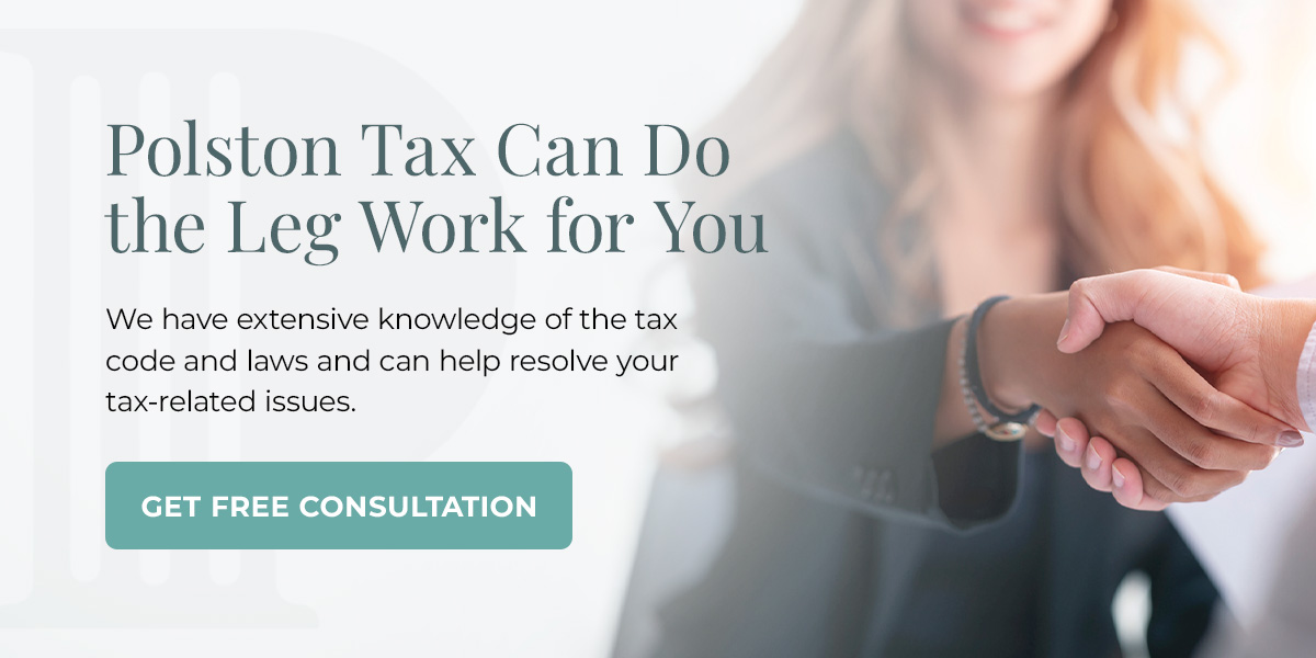 Remember, you don’t have to shoulder all this problem alone. Tax professionals like Polston Tax can do the work for you. If you need to prepare your tax returns or if you have unpaid taxes that need to be resolved, we can help you. We have extensive knowledge of the tax code and laws and can help resolve your tax-related issues with the IRS or the state. Schedule a free consultation today!