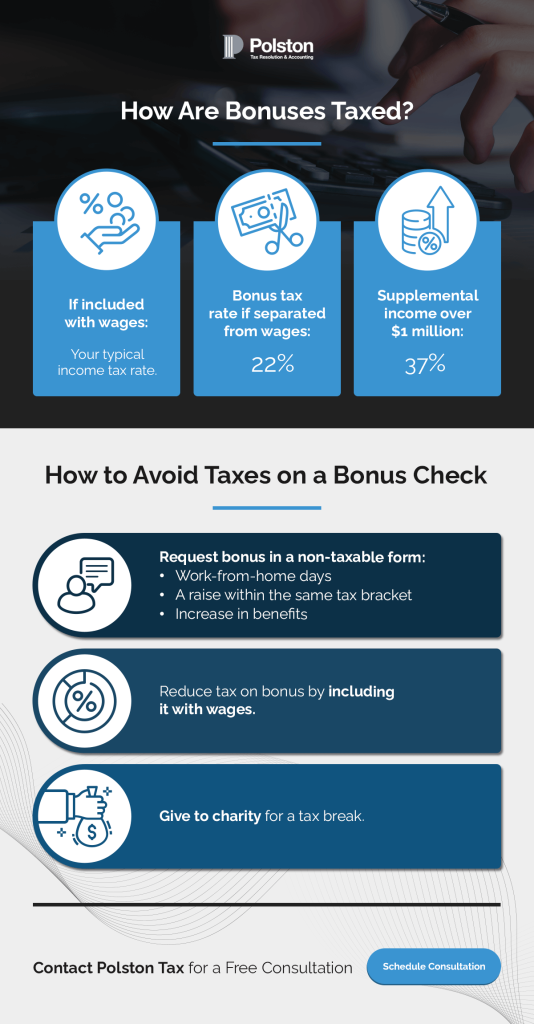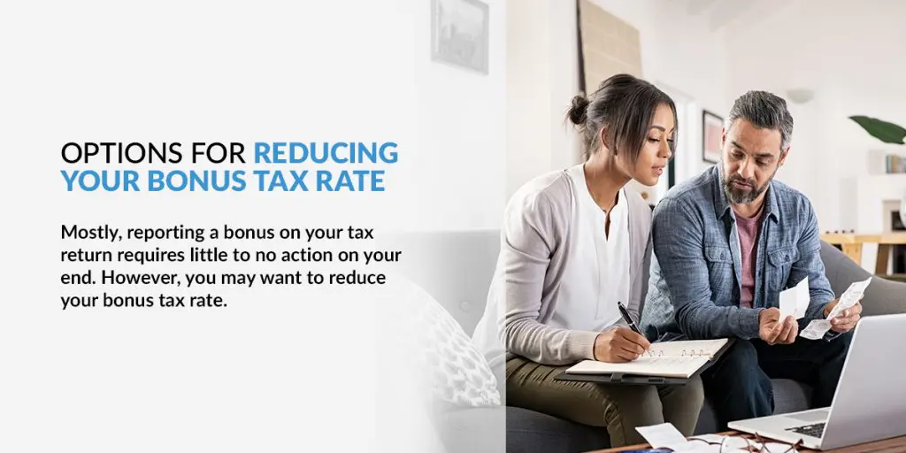 Mostly, reporting a bonus on your tax return requires little to no action on your end. However, you may want to reduce your bonus tax rate. If your employer separates your bonus from your wages, the IRS will tax you 22% — and your tax bracket may be less than that. Additionally, supplemental income that exceeds $1 million is taxed at 37% once it surpasses that mark, which may be more than you want to pay.